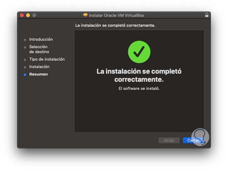 Damos clic en Instalar software y se dará comienzo a la instalación de VirtualBox en macOS Mojave. Una vez este proceso finalice veremos lo siguiente: