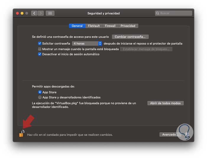 Debemos ir a "Preferencias del sistema" y en la sección "Privacidad y seguridad" encontramos lo siguiente. Allí debemos pulsar en el icono de candado ubicado en la parte inferior para realizar cambios y será necesario pulsar en el botón "Abrir de todos modos" para permitir la instalación de VirtualBox en macOS Mojave.