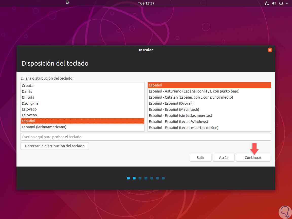 Allí seleccionamos el idioma en el costado lateral izquierdo y damos clic en la opción “Instalar Ubuntu”, se desplegará la siguiente ventana donde definimos el idioma del teclado a usar: