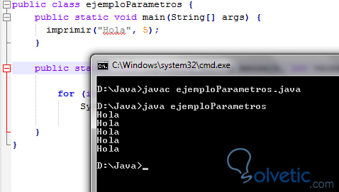 Veamos este ejemplo a continuación, queremos crear un método que imprima una cadena una cantidad de veces, para ello nuestro método va a recibir la cadena primero y luego un número entero de veces a imprimir el valor: