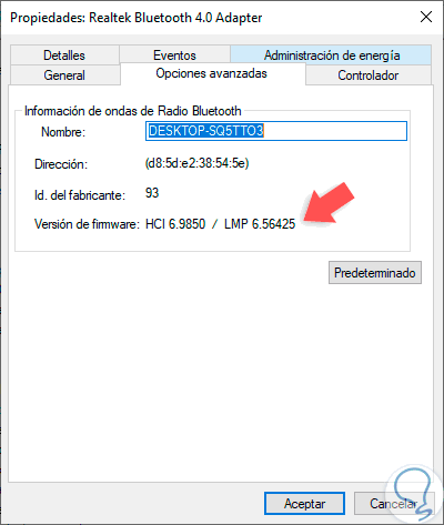 En la ventana desplegada vamos a la pestaña "Opciones avanzadas". Allí veremos la versión del Bluetooth en la línea Versión del firmware en el campo LMP: