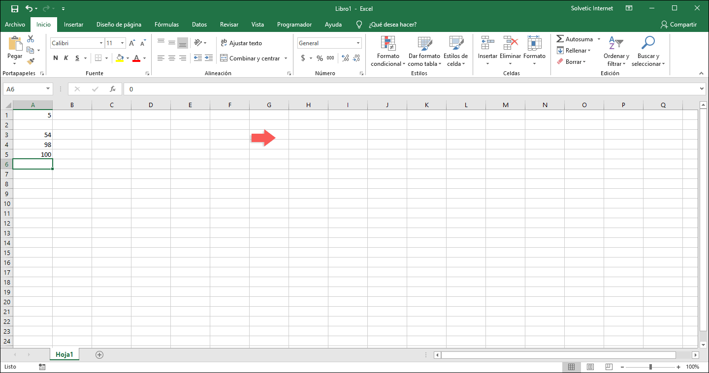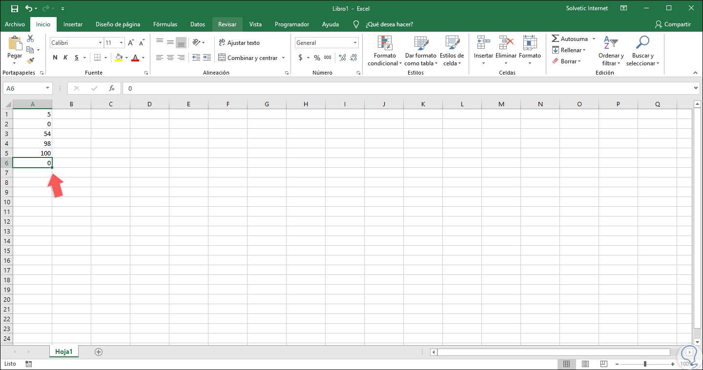 Observamos que en las celdas A2 y A6 hemos ingresado cero, pero automáticamente Excel 2019 no despliega estos valores lo cual puede tener un impacto negativo a la hora de realizar funciones y fórmulas sobre estas.