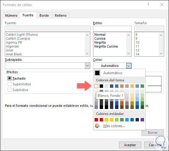 En la nueva ventana vamos a la pestaña “Fuente” y en Colores seleccionamos Blanco: