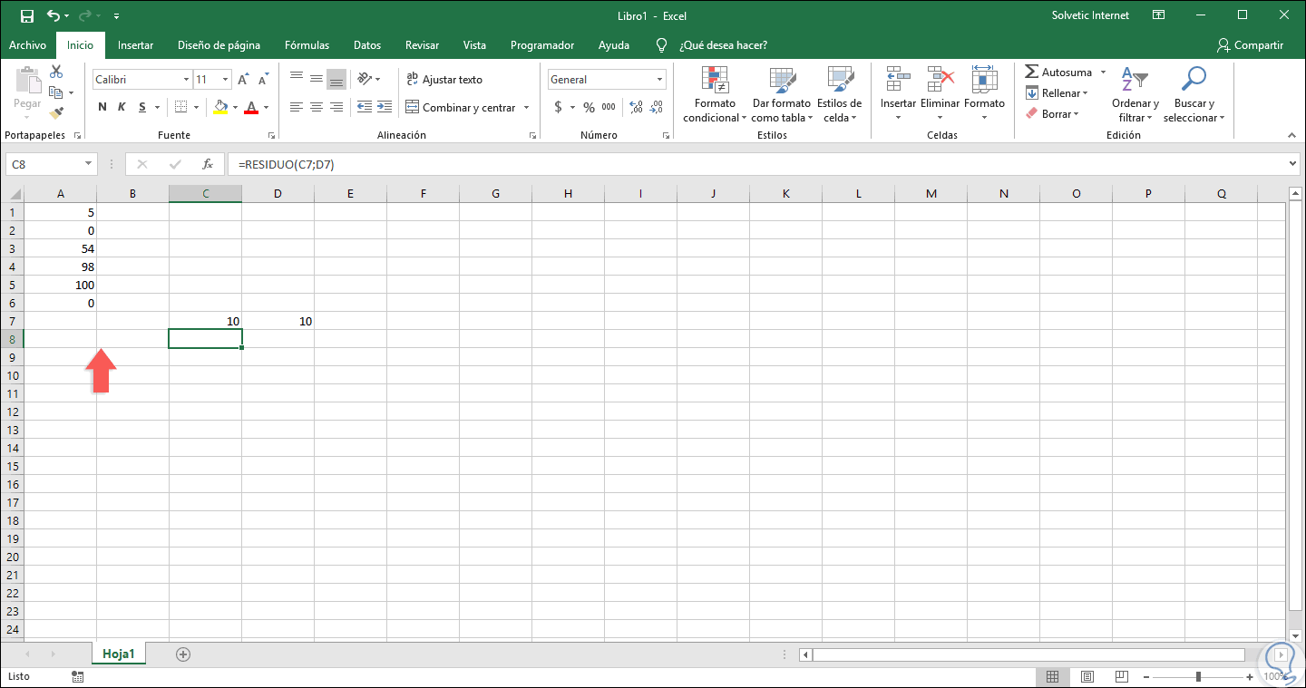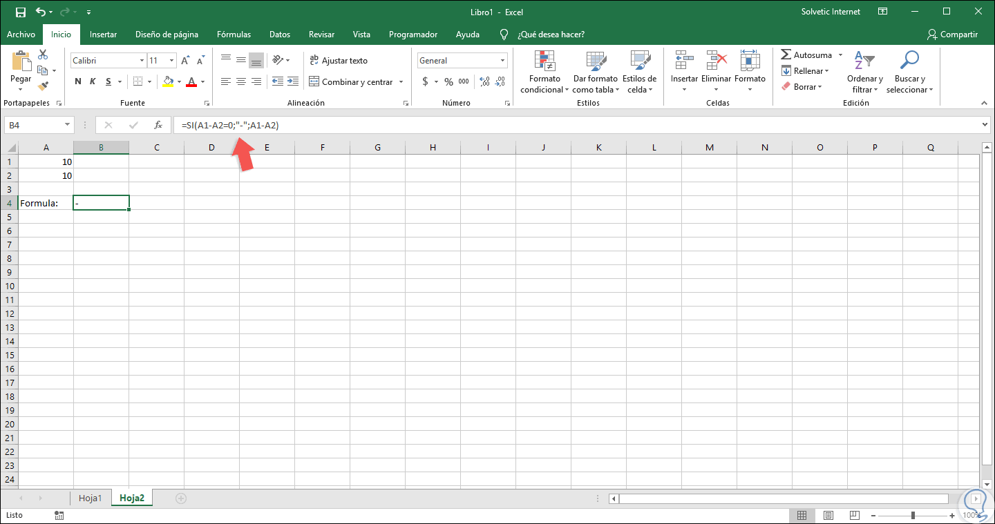 Para este proceso usaremos la función Si la cual determinara que si el resultado de una operación es igual a cero este se ocultara, para este caso ejecutamos lo siguiente con los valores de las celdas A1y A2:
