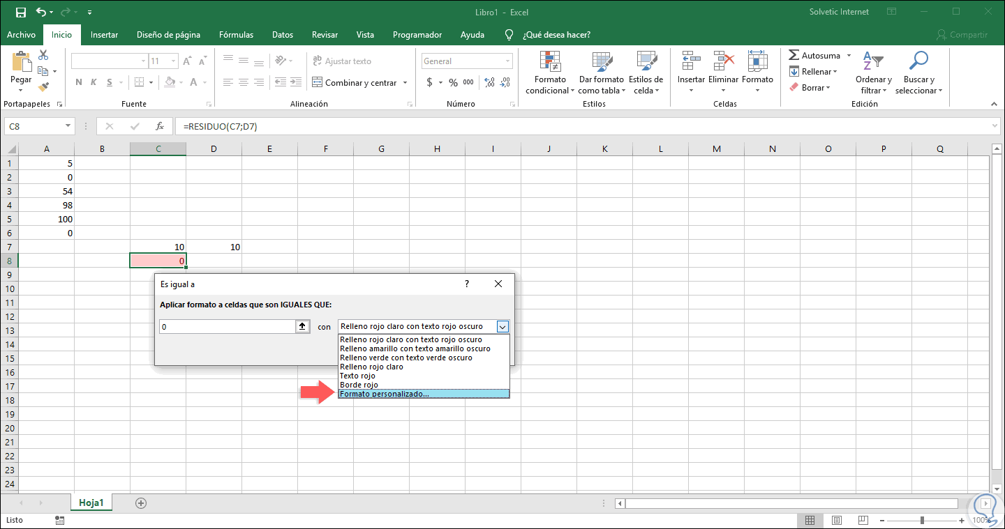 En la ventana desplegada ingresamos el 0 y en el menú derecho seleccionamos “Formato personalizado”: