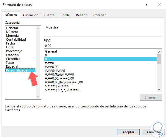 En la ventana desplegada vamos a la pestaña “Número” y allí seleccionaremos la línea “Personalizada”: