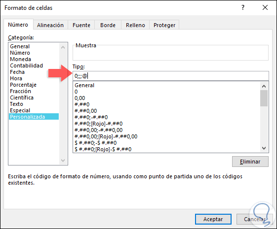 En el campo “Tipo” ingresaremos lo siguiente. Pulsamos en Aceptar para aplicar los cambios y así se ocultarán los valores en cero.