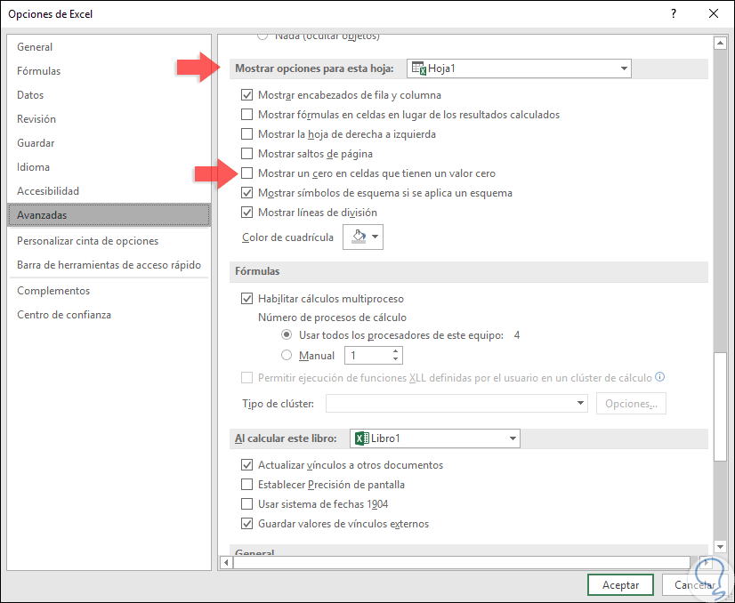 En la ventana que será desplegada, vamos a la categoría “Avanzadas” y en el panel derecho ubicaremos la sección “Mostrar opciones para esta hoja” y allí tendremos las siguientes opciones: