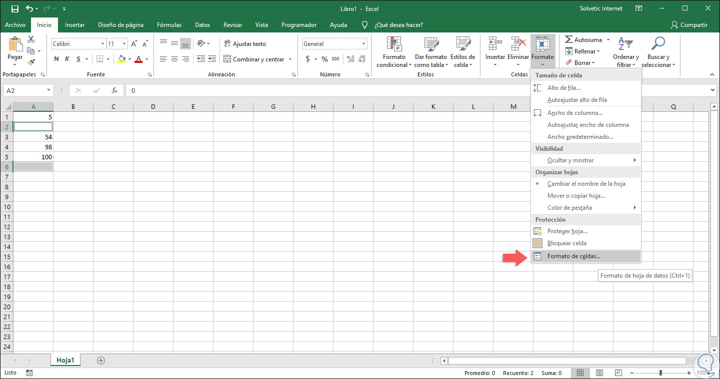 Para este caso seleccionamos las celdas que contienen los valores ceros ocultos y luego podemos usar las teclas siguientes o ir nuevamente a la ruta “Inicio”, grupo “Celdas” y allí dar clic sobre la opción “Formato” para seleccionar “Formato de celdas”.