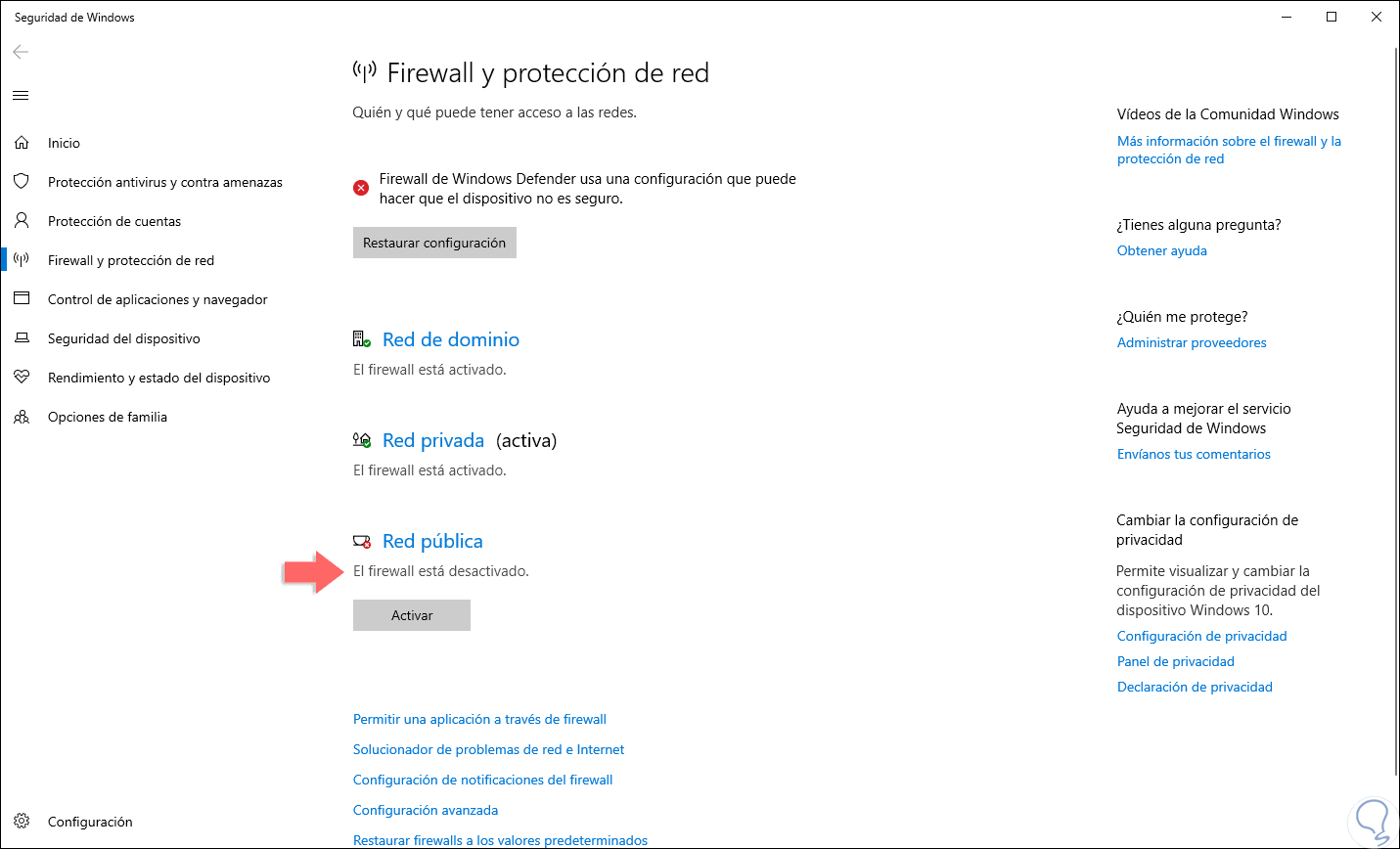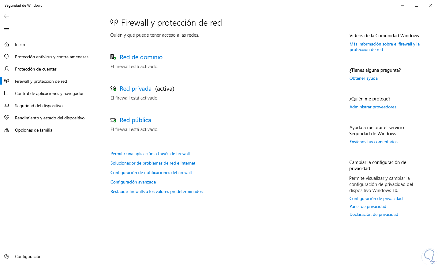 Allí damos clic en la línea “Firewall de Windows” y a continuación veremos las redes disponibles, así como el estado del firewall en cada una de ellas: