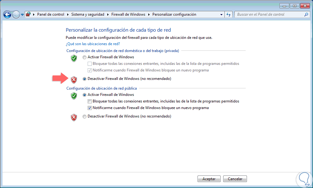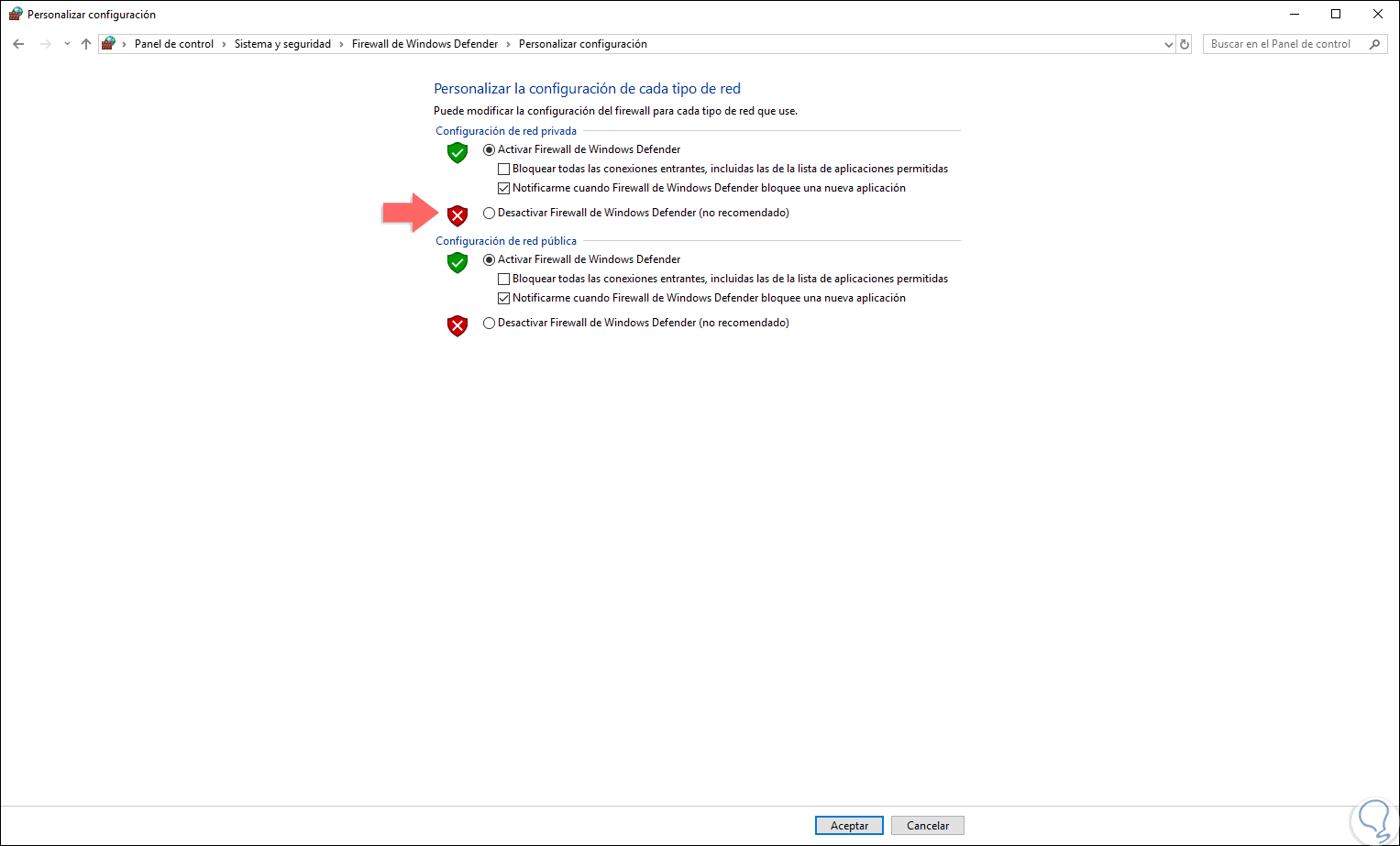 Allí debemos activar la casilla “Desactivar Firewall de Windows Defender (no recomendado)” para que este se deshabilite y pulsamos en Aceptar para guardar los cambios. Así podremos deshabilitar el firewall en la red seleccionada. Recordemos que el firewall en Windows 10 cuenta con características de mayor seguridad ya que allí será posible gestionar protocolos como: