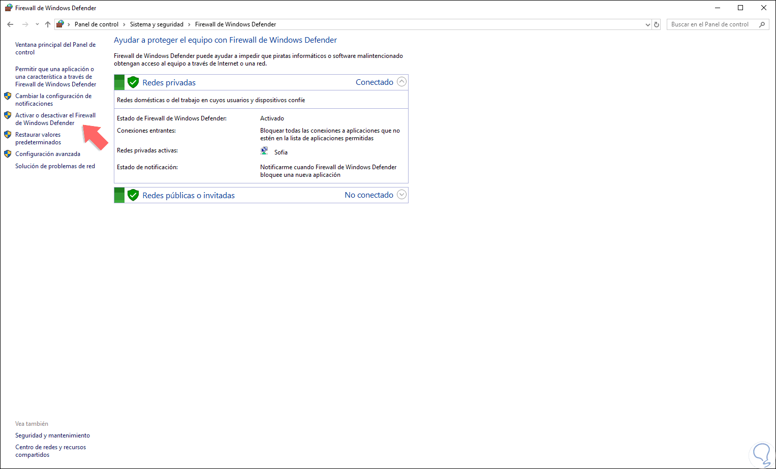 En primer lugar, podemos ver las redes disponibles y su estado actual, ahora debemos seleccionar la línea “Activar o desactivar el Firewall de Windows Defender” y se desplegará lo siguiente: