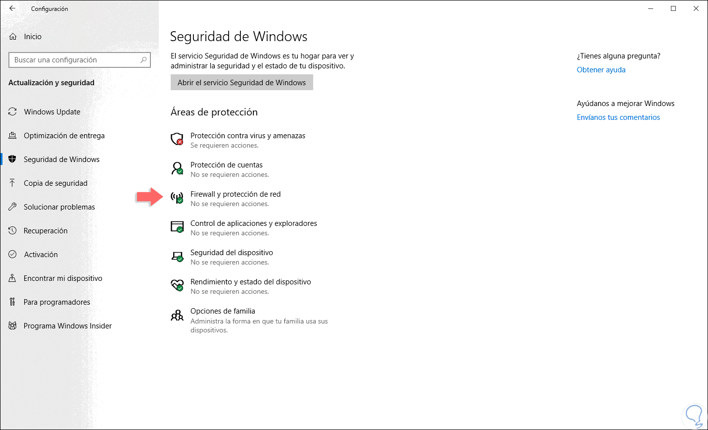 Allí vamos a la sección “Actualización y seguridad” y en la nueva ventana desplegada vamos a la categoría “Seguridad de Windows” donde se desplegarán las siguientes opciones:
