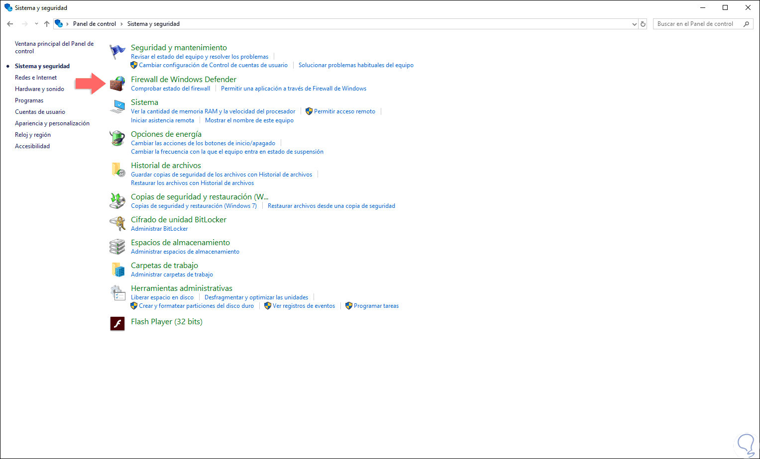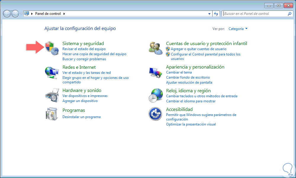 Allí damos clic en la línea “Sistema y seguridad” y se desplegará lo siguiente: