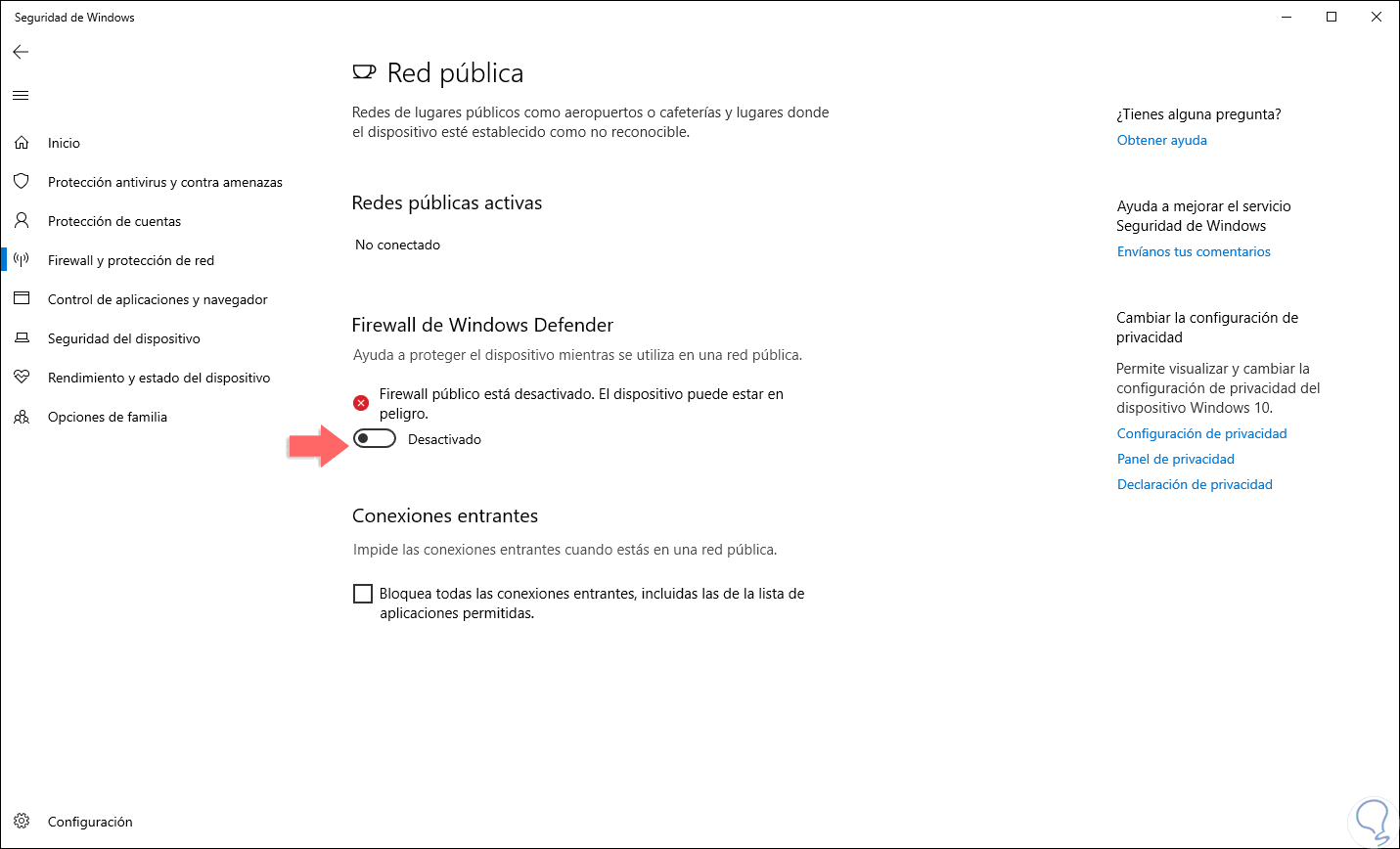 Damos clic en el botón Sí y automáticamente veremos que el firewall ha sido deshabilitado en dicha red: