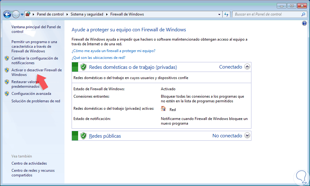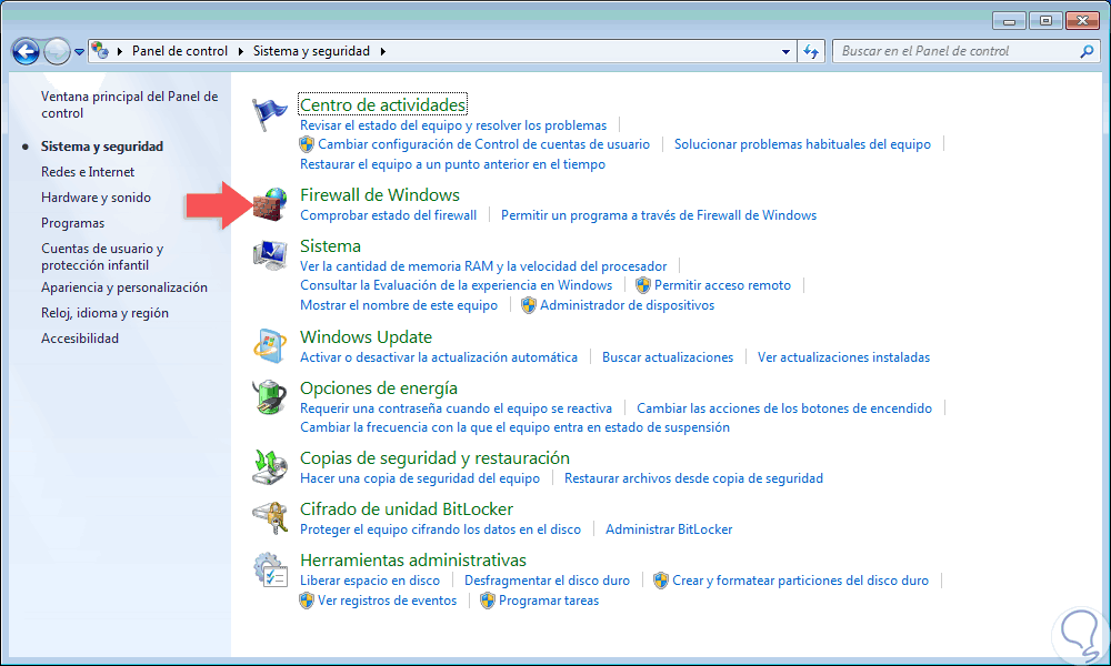 Si deseamos deshabilitar el firewall integrado en Windows 7 debemos ir al Panel de control donde veremos lo siguiente: