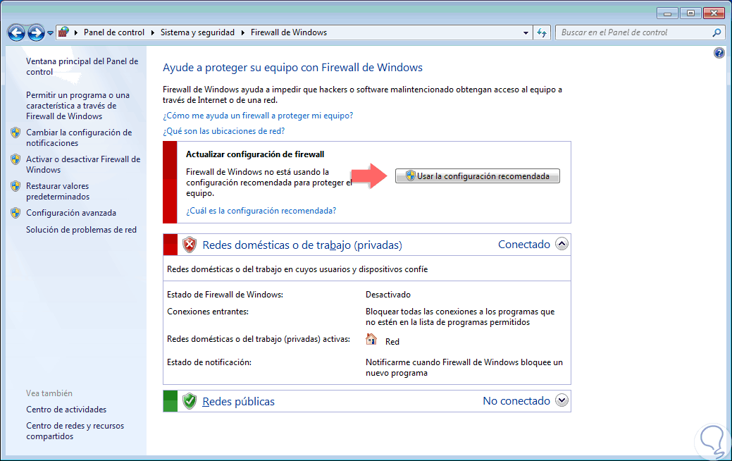 Pulsamos en Aceptar para aplicar los cambios y podemos ver que dicha red ha sido deshabilitada. Si deseamos activarla de nuevo, podemos dar clic en el botón “Usar la configuración recomendada” o bien pulsar de nuevo en la línea “Activar o desactivar Firewall de Windows” y en la ventana desplegada activar la casilla “Activar Firewall de Windows” y pulsar en Aceptar.