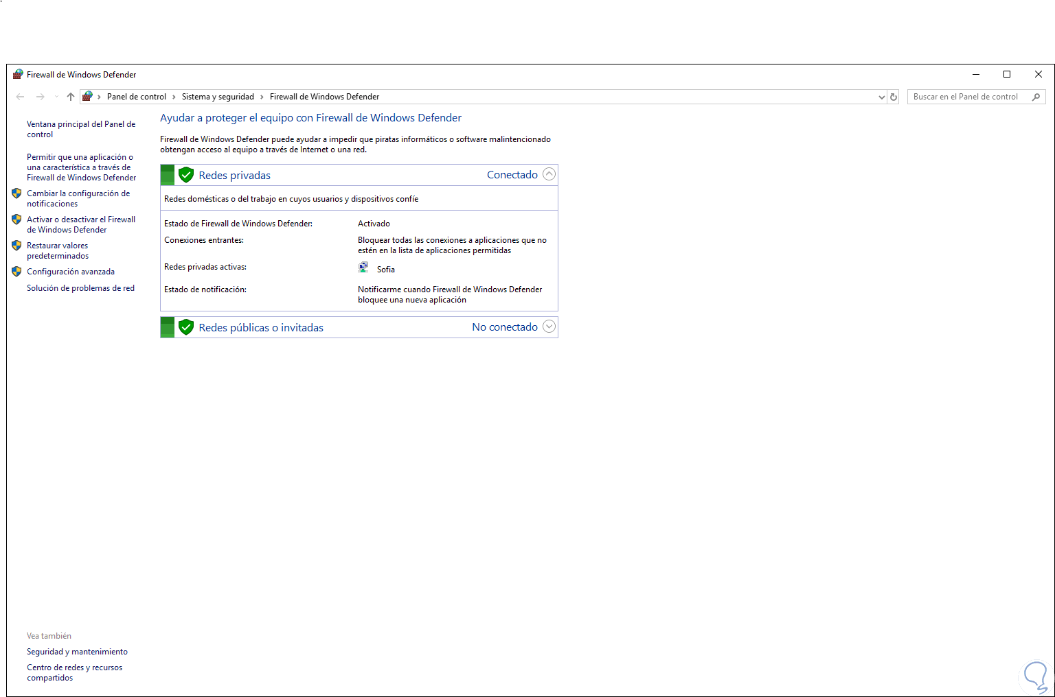Al acceder a esta ventana podemos ver cuál es nuestra red actual y el estado del firewall para cada una de las redes: