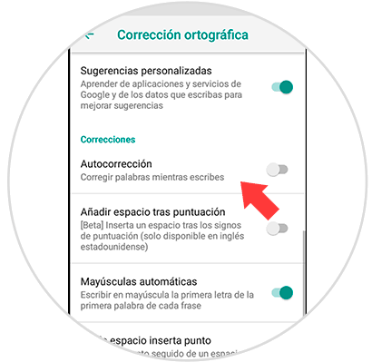 Ahora desplaza el botón azul para desactivar la opción de auto corrección en teclado.