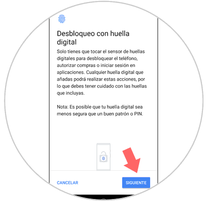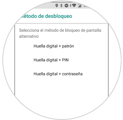 Para mayor seguridad a la hora de que no nos acepte la huella dactilar, nos pedirá un método de seguridad de los comunes ya sea contraseña, pin o patrón. Por esto debemos elegir una de estas tres opciones la cual queremos que acompañe la huella dactilar.