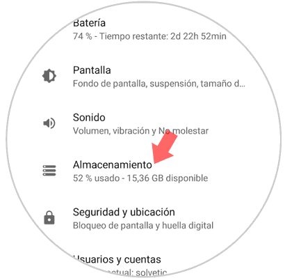 En la ventana de la opción de ajustes encontrarás otra variedad de opciones más, dentro de ésta debes deslizar la pantalla hasta encontrar la opción de "Almacenamiento", y la seleccionas pulsando en ella.