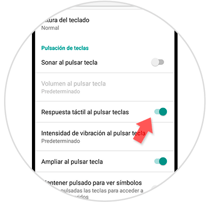 En esta última ventana nos desplazamos hasta la opción de “Respuesta táctil al pulsar teclas” y la desactivamos para evitar que vibre nuestro teclado.