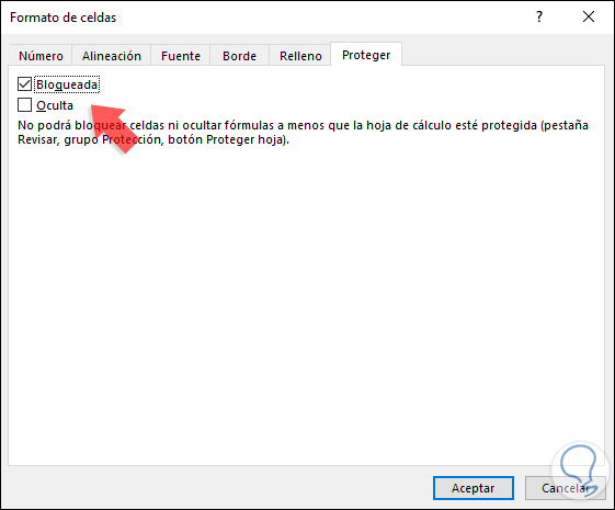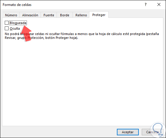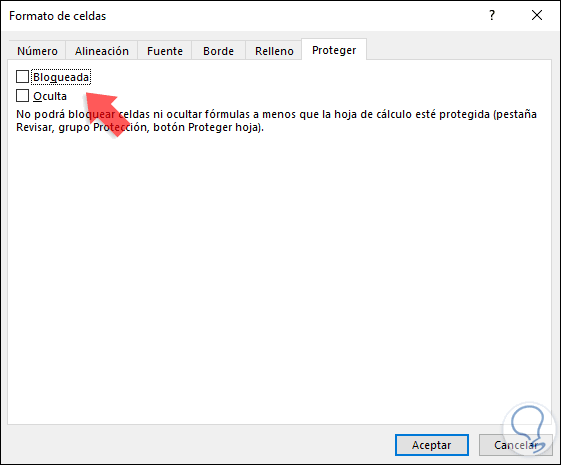 En la ventana desplegada iremos a la pestaña “Proteger” y allí debemos desactivar la casilla “Bloqueada” la cual se encuentra activa por defecto. Pulsamos en Aceptar para guardar los cambios.