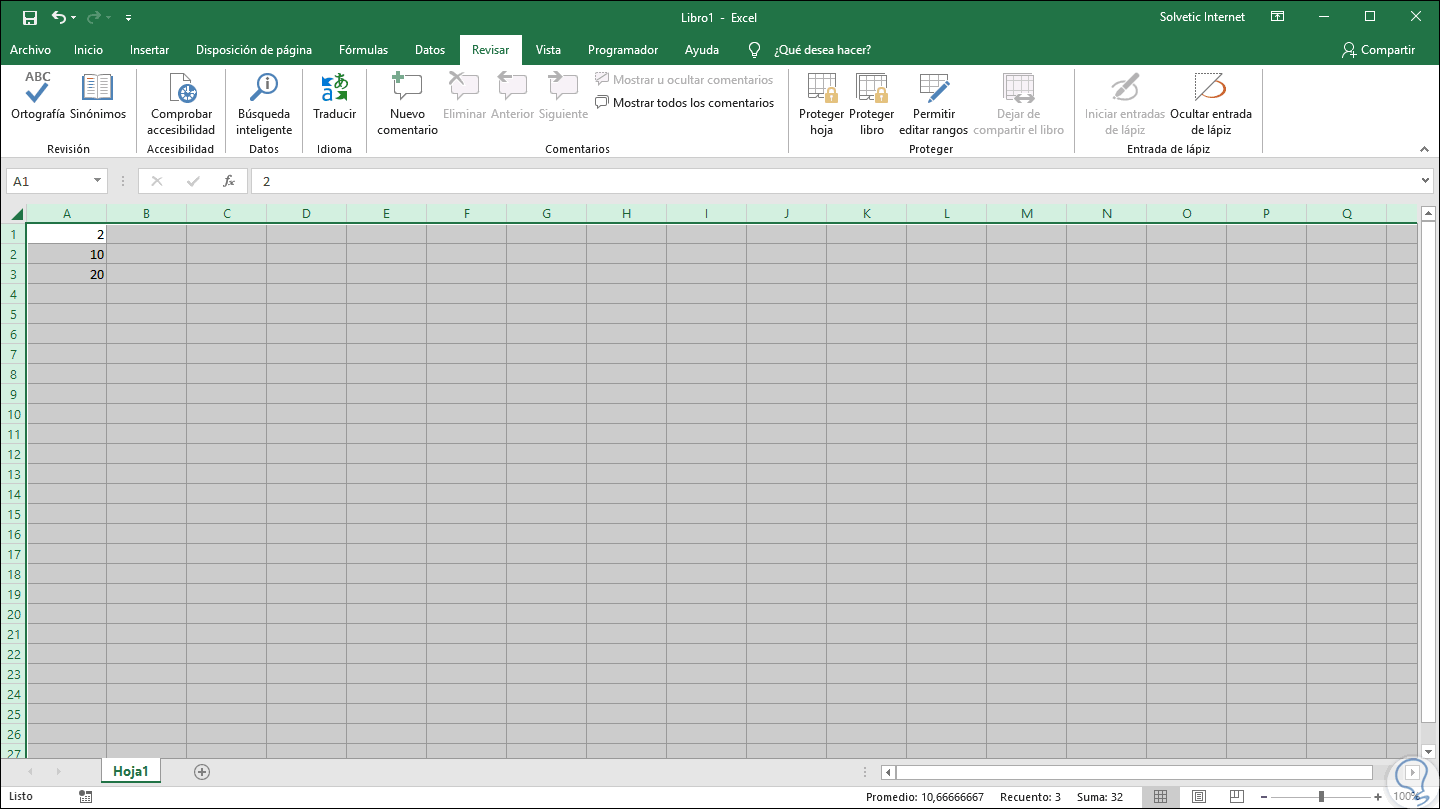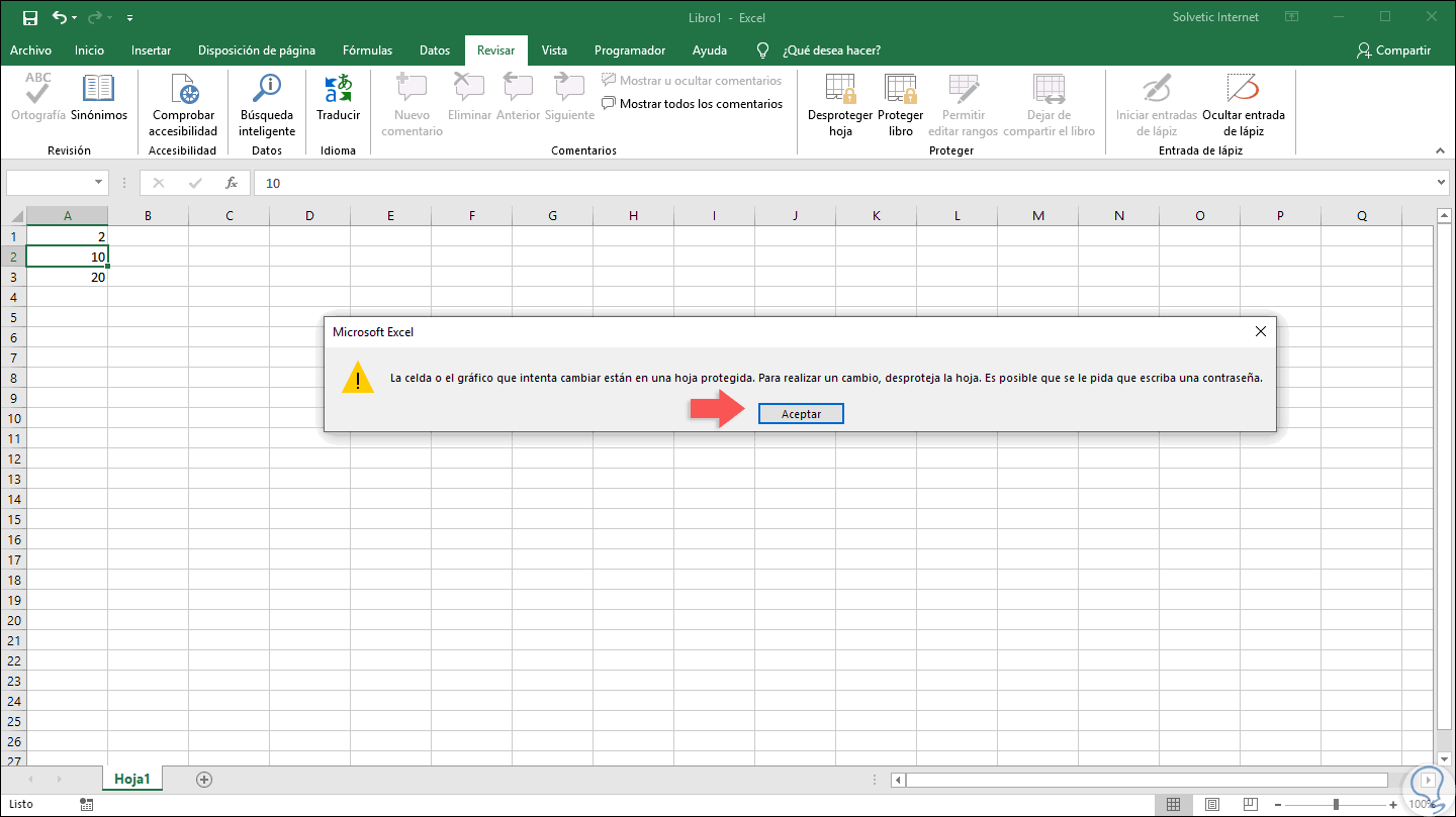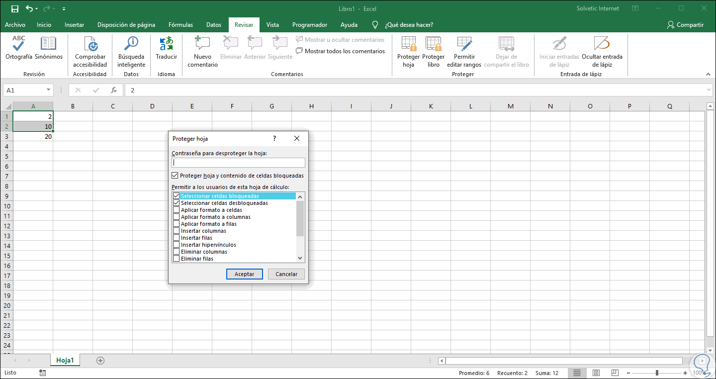 Pulsamos en Aceptar, vamos al menú “Revisar” para pulsar sobre la opción “Proteger hoja” y ahora solo este rango de celdas estará bloqueado para su edición:
