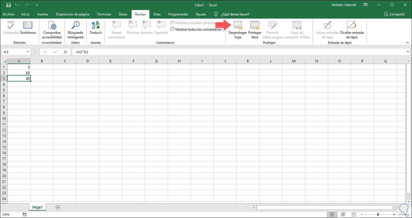 Para quitar esta protección, iremos de nuevo al menú “Revisar” y en el grupo “Proteger” daremos clic en la opción “Desproteger hoja”. Esto activará todas las opciones de edición de la hoja seleccionada.