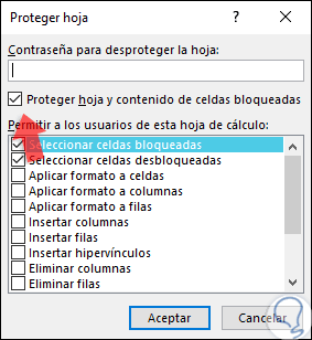 Después de esto volvemos al menú “Revisar” y damos clic en “Proteger hoja”. Allí pulsamos en “Aceptar” y ahora será posible editar la celda seleccionadas pero no las demás celdas de la hoja activa de Excel 2019.