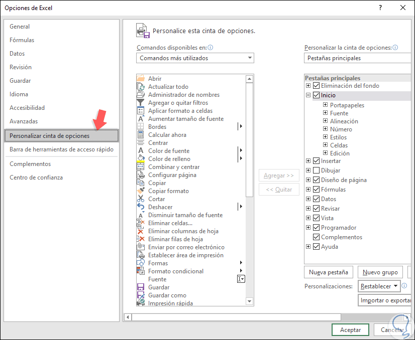 Otro método alterno, es usando el menú Programador, en caso de no contar con el (recordemos que esta deshabilitado por defecto), debemos ir al menú “Archivo / Opciones” y allí ir a la sección “Personalizar la cinta de opciones”: