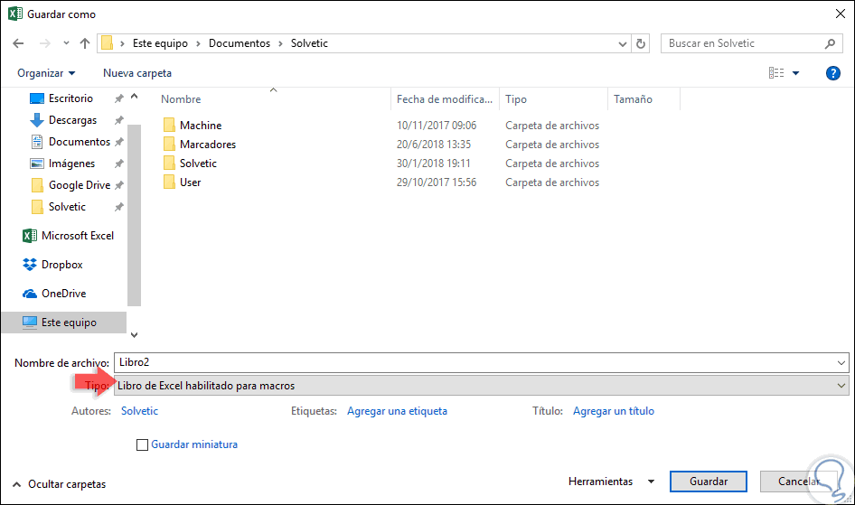 Una vez tengamos insertado este script en el editor de Excel, procedemos a guardarlo para futuras tareas, para ello vamos al menú “Archivo / Guardar cómo” y en la ventana desplegada seleccionamos la opción “Libro de Excel habilitado para macros” y asignamos un nombre al mismo. Pulsamos en Guardar y estaremos listos para usar esta fórmula creada.