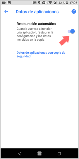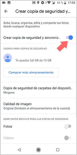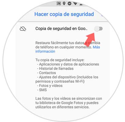 En la parte superior leeremos “Copia de seguridad de google” deslizaremos la barra de izquierda a derecha para activarla.