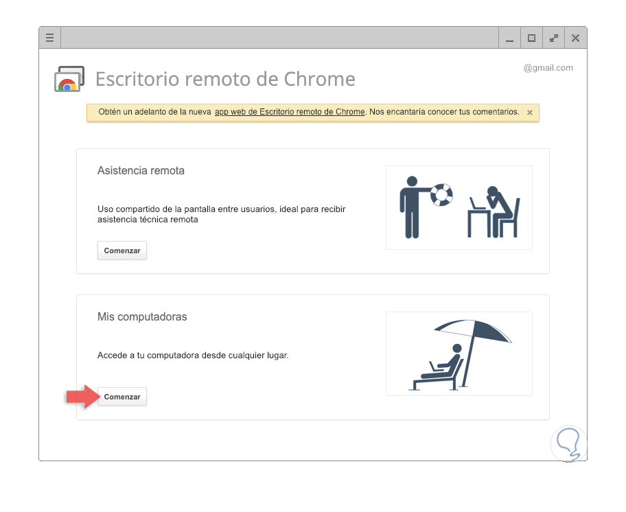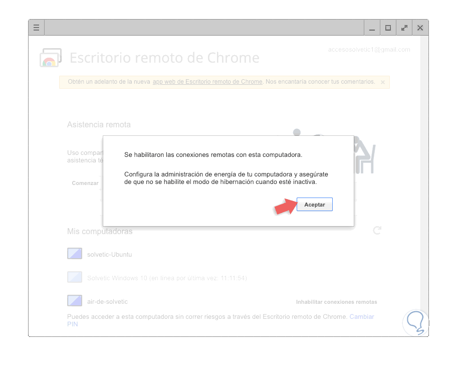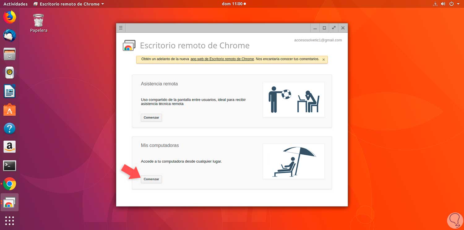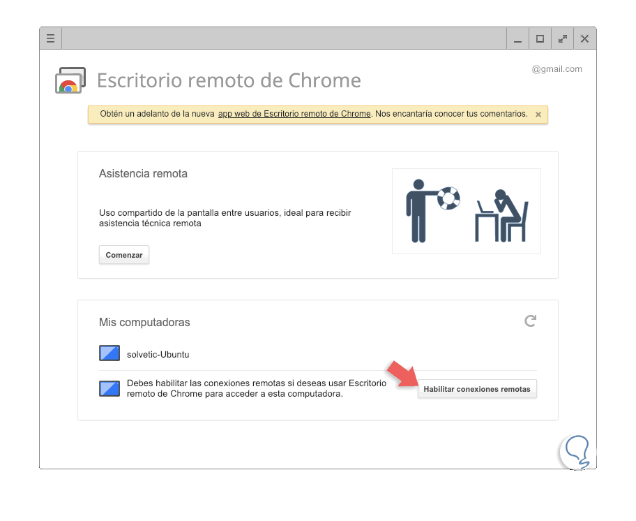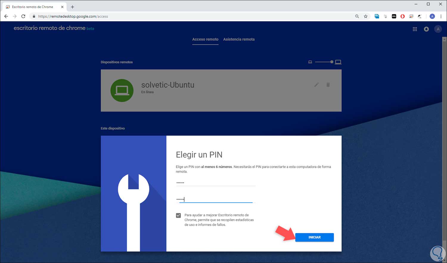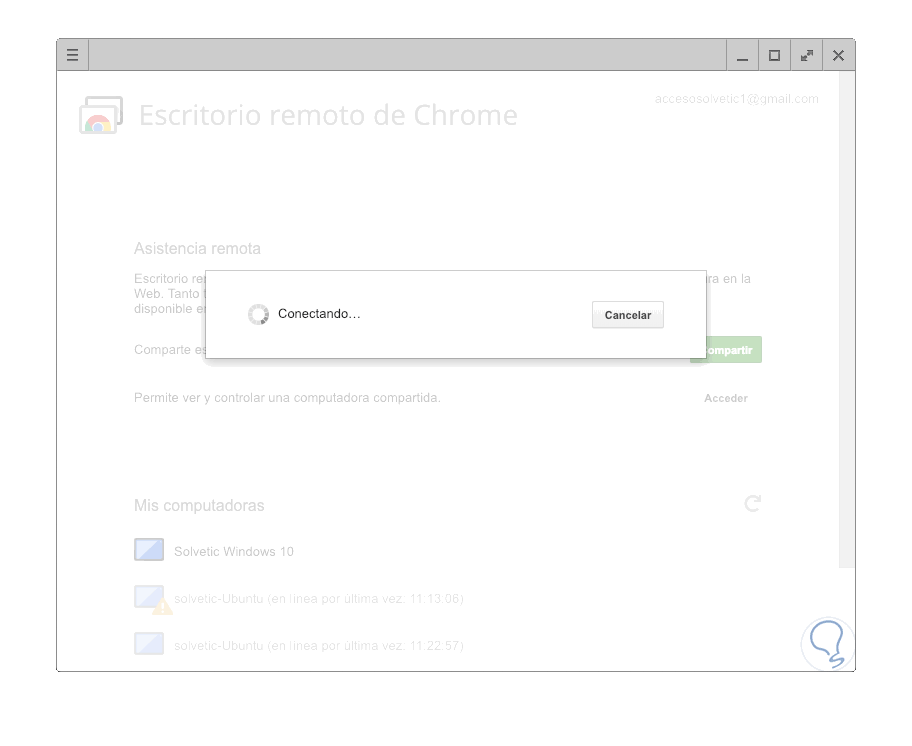 Allí se dará inicio al proceso de conexión con el escritorio remoto de Chrome: