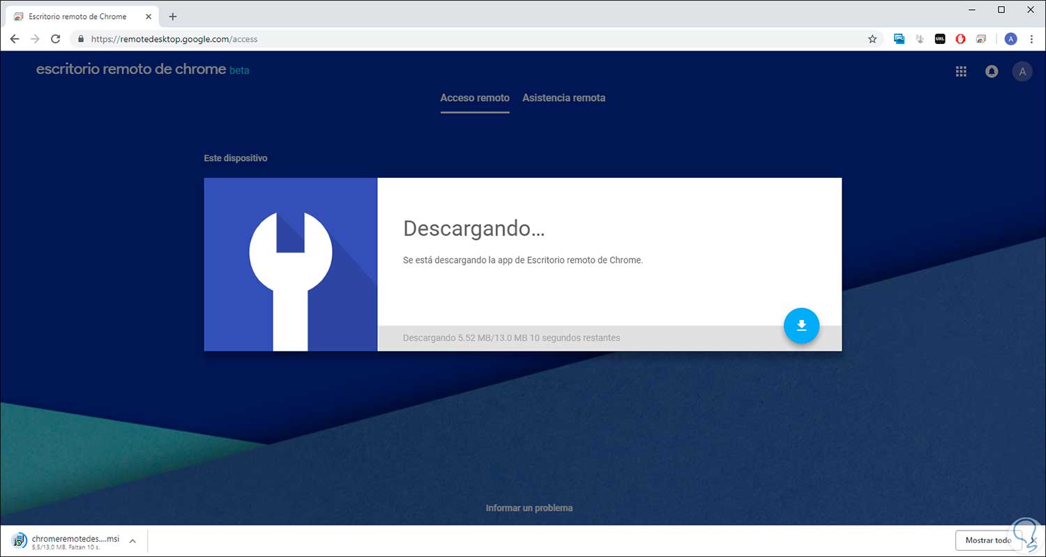 Posteriormente podemos ver que se da inicio al proceso de descarga del escritorio remoto de Chrome: