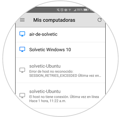 Una vez instalada, accedemos a la aplicación y allí pulsamos sobre el equipo al cual deseamos acceder, en caso de que este aparezca atenuado, significa que no tiene conexión o que no está disponible en el momento: