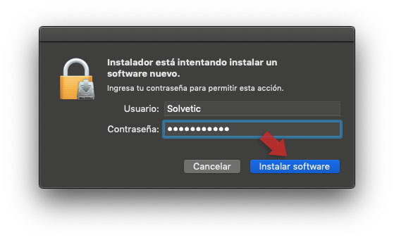 Será necesario ingresar nuestra contraseña de administrador. Damos clic en "Instalar software" para proceder con el proceso: