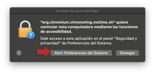 Al pulsar en Aceptar se desplegará el siguiente mensaje. Allí debemos autorizar al escritorio remoto de Chrome las funciones de acceso del sistema. Para ello damos clic en "Abrir Preferencias del Sistema".
