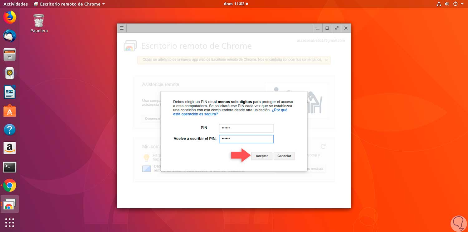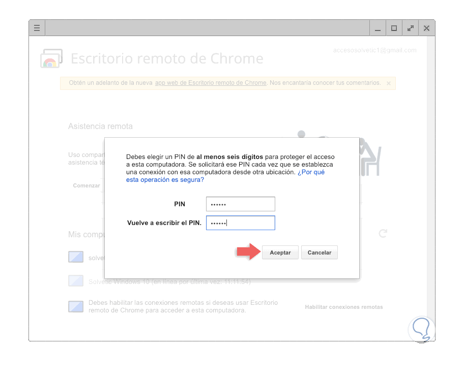 Será necesario ingresar un PIN y confirmarlo el cual será requerido cuando hagamos uso del escritorio remoto. Pulsamos en "Aceptar".