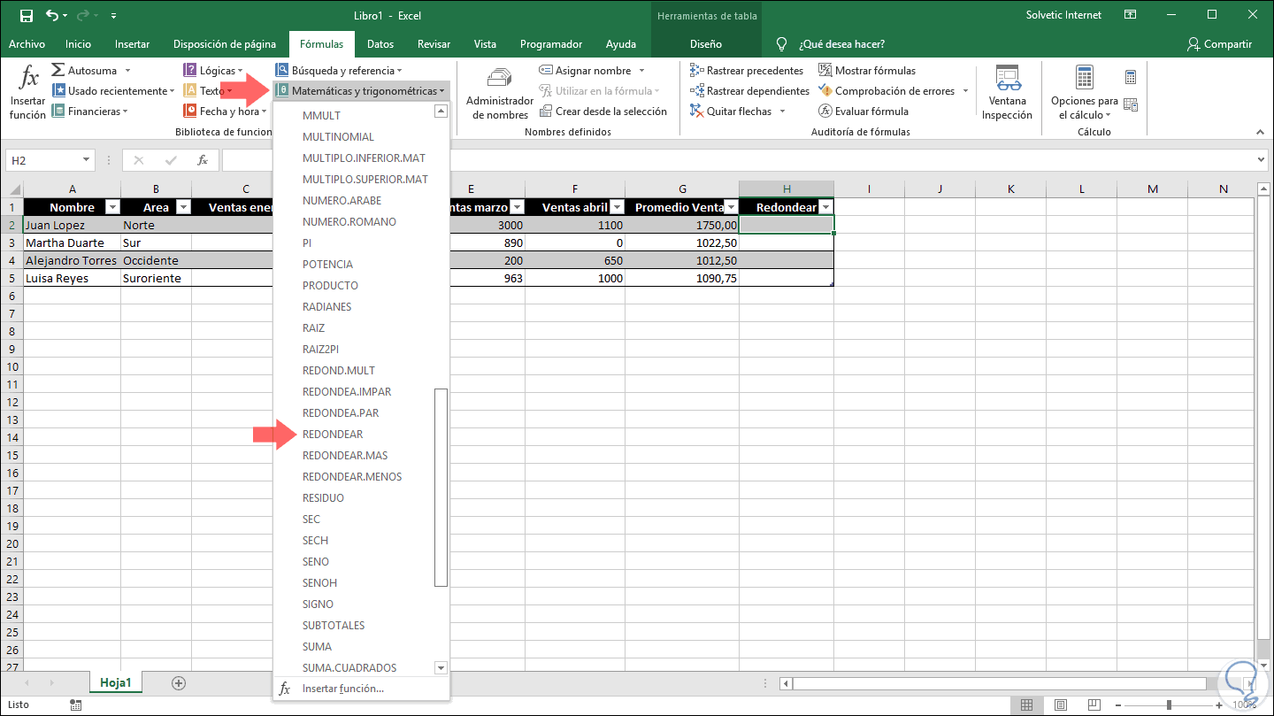 Para ello ubicamos el cursor en la celda deseada y en el menú Formulas damos clic sobre "Biblioteca de funciones" y allí pulsamos en la categoría "Matemáticas y trigonométricas" y en el listado desplegado buscamos la función Redondear:
