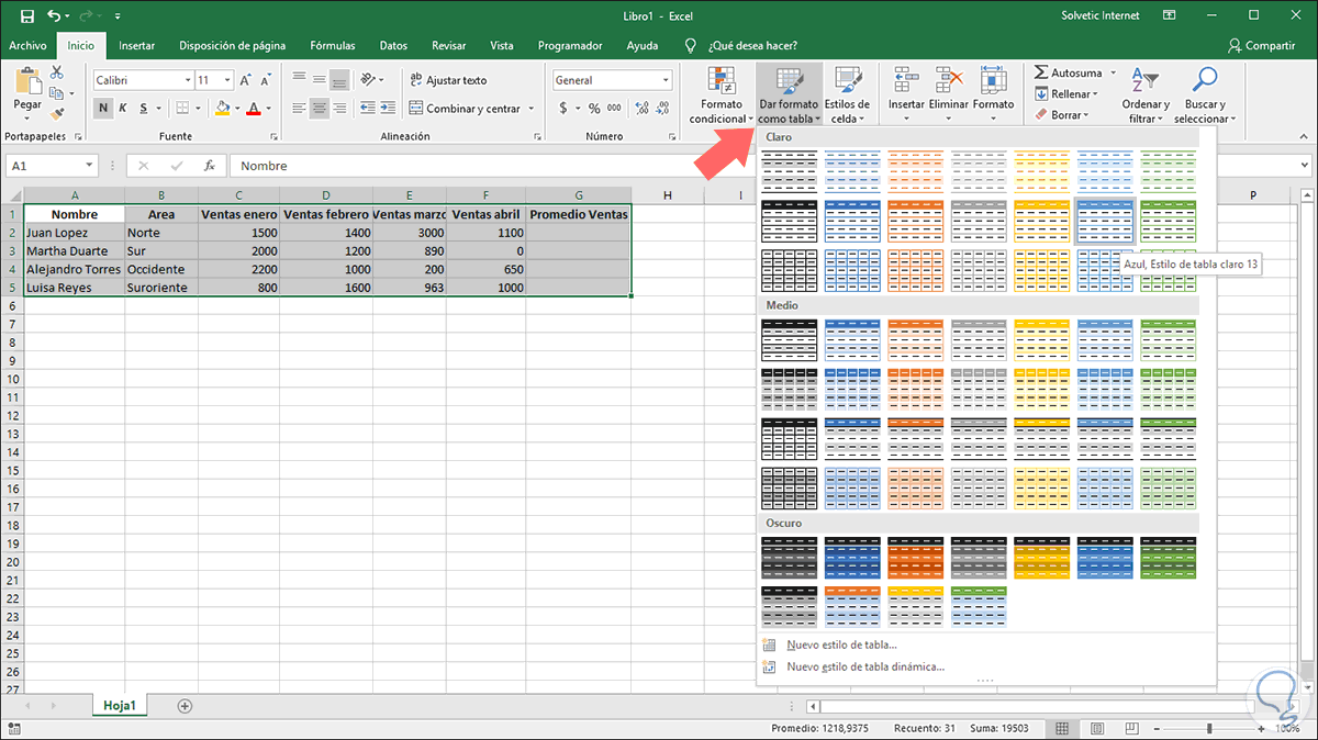 La primera opción implica convertir los datos registrados al formato tabla y a partir de allí realizar el proceso. Para este método, seleccionaremos los datos a calcular y nos dirigimos al menú Inicio y en el grupo "Estilos" damos clic sobre la opción "Dar formato como tabla" y en las opciones desplegada seleccionamos la mas adecuada para nuestro reporte: