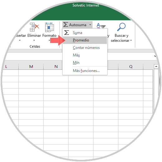 Para este proceso debemos dar clic en una celda debajo o a la derecha de los números sobre los cuales se va a calcular el promedio, una vez seleccionada la celda, iremos al menú Inicio y en el grupo Edición damos clic en la opción Autosuma y allí seleccionamos la opción Promedio: