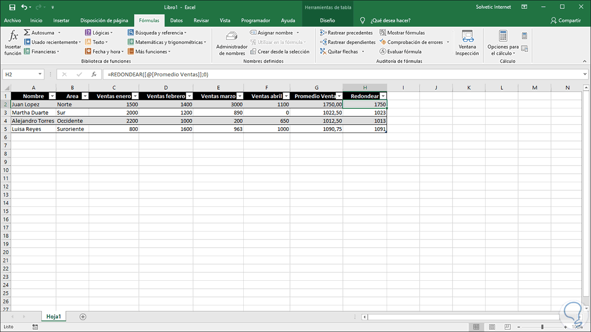 Como podemos observar, estos valores son calculados en base a los datos registrados. Es probable que deseemos redondear estos con el fin de no tener valores decimales en el resultado. Si este es el objetivo, podemos ir a una nueva celda y usar la función redondear.