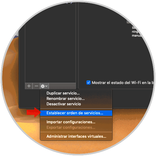Allí debemos dar clic en la categoría Red y en la ventana que será desplegada damos clic en el icono de piñón ubicado en la parte inferior y seleccionamos la opción Establecer orden de servicios: