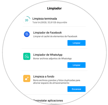 Tras el borrado de datos en la liberación de espacio podremos ver más funciones de limpieza. Podremos ejecutar de forma independiente gestores como el limpiador de WhatsApp o una limpieza a fondo de archivos.