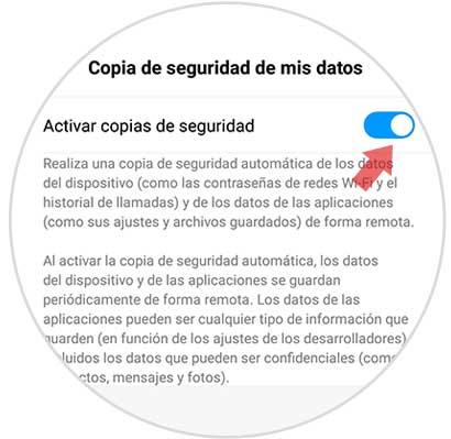 Para concluir el procedimiento, deberás activar la opción “Activar copias de seguridad”; que puedes lograr deslizando la pestaña que aparece junto a ella. Así pues, las copias de tus datos personales quedarán guardadas.