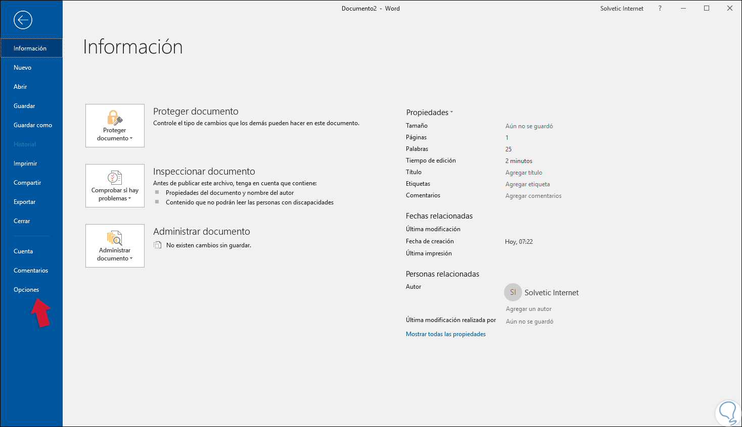Ahora, existen algunas opciones que podemos editar al usar la regla en Word 2019, para ello debemos ir al menú “Archivo” y allí seleccionar “Opciones”: