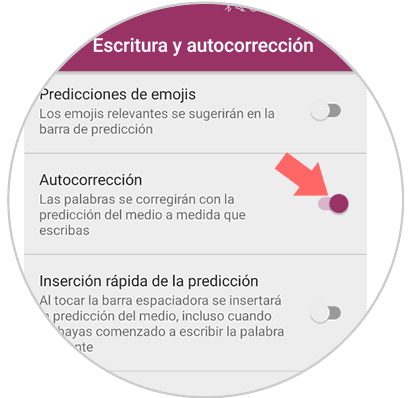 Podemos ver ahora cómo aparece una ventana con algunas opciones. Solo tenemos que deslizar hacia la izquierda la pestaña de autocorrección para desactivar esta opción.