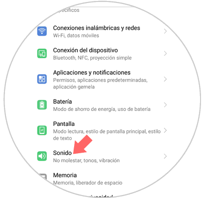 Al hacerlo será posible visualizar una lista donde se muestran las alternativas siguientes: conexiones inalámbricas y redes, conexión del dispositivo, aplicaciones y notificaciones, baterías, pantalla, sonido y memoria, debemos escoger y presionar la opción “Sonido”.