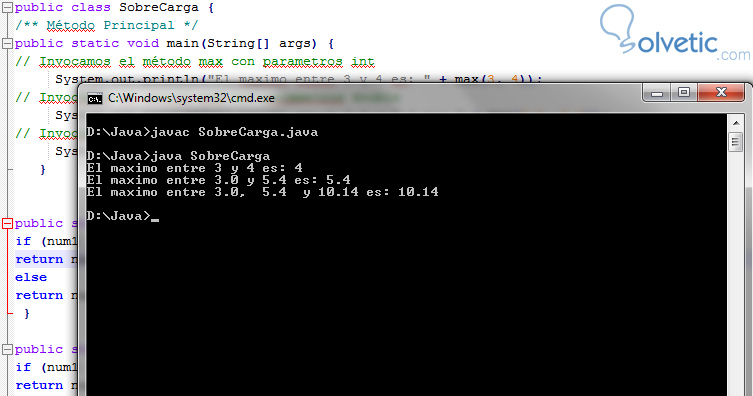 En el siguiente ejemplo vamos a hacer un programa donde calcularemos el valor mayor entre unos números dados, estos pueden ser int o double e inclusive vamos a cambiar el número de parámetros que se reciben. Veamos el código: